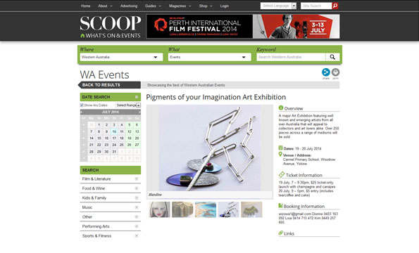 In the media Scoop – What’s On in Western Australia – review on Pigments of Your Imagination Art Show with Blandine Hallé’s pendant photo. Scoop online magazine June 2014 Opening Saturday 19 July, Exhibition & Sales on Sunday 20 July Rate this:Share this: Blandine Halle Click to email a link to a friend (Opens in new window) Email Click to share on WhatsApp (Opens in new window) WhatsApp Click to share on Facebook (Opens in new window) Facebook Click to share on LinkedIn (Opens in new window) LinkedIn Click to share on X (Opens in new window) X Like Loading... Related