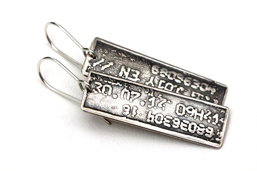 This serie of earrings was made in response to the ‘Marken-Schmuck’ exhibition theme. I interpreted the meaning of ‘stamp’ as in ‘to create a mark by pressing a special tool against a surface’. When we validate our transport tickets, a location, date & time is stamped on the ticket.