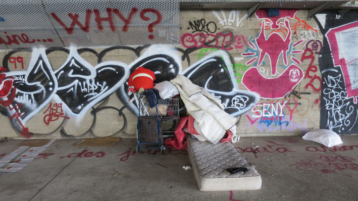 Ces mêmes rues qui sont aussi le lieu de vie de nombreux sans-abris – la confrontation d’une réalité quotidienne