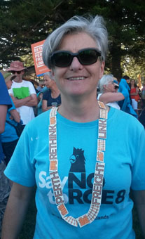 Le collier aujourd’hui a servi à défendre un point de vue politique et écologique. Je suis allée à une manifestation pour protester contre le gouvernement d’Australie Occidentale qui veut construire une autoroute à 6 voies (appelée Roe 8) à travers les dernières zones humides (bush, lacs et marécages) à Perth. Il y a un fort mouvement qui grandit pour protester contre la planification d’une infrastructure de route à péage pour le transport des marchandises par camions entre l’intérieur des terres et le port de Fremantle. « Rethink Perth Freight Link » (qui veut dire « Repenser la liaison de transport à Perth ») est une alliance de groupes et organisations qui s’opposent au projet de Perth Freight Link et la destruction des zones humides de Beeliar et qui promeut des solutions alternatives et durables de transport. Ces solutions incluent l’accroissement du transport de marchandises par rail, ce qui a inspiré le design de ce collier.