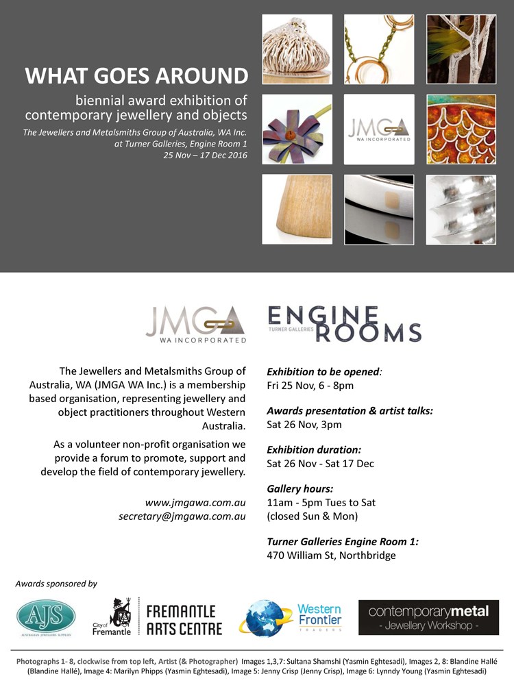 Voici une invitation pour venir voir deux de mes œuvres à cette exposition de groupe qui ouvre à Perth ce vendredi 25 novembre. Celle-ci est organisée par le groupe JMGA (WA) et a lieu tous les 2 ans seulement. Cette année elle se déroule à la galerie Turner, une des plus renommées de Perth. Les œuvres de 44 artistes locaux du bijou contemporain seront présentées.