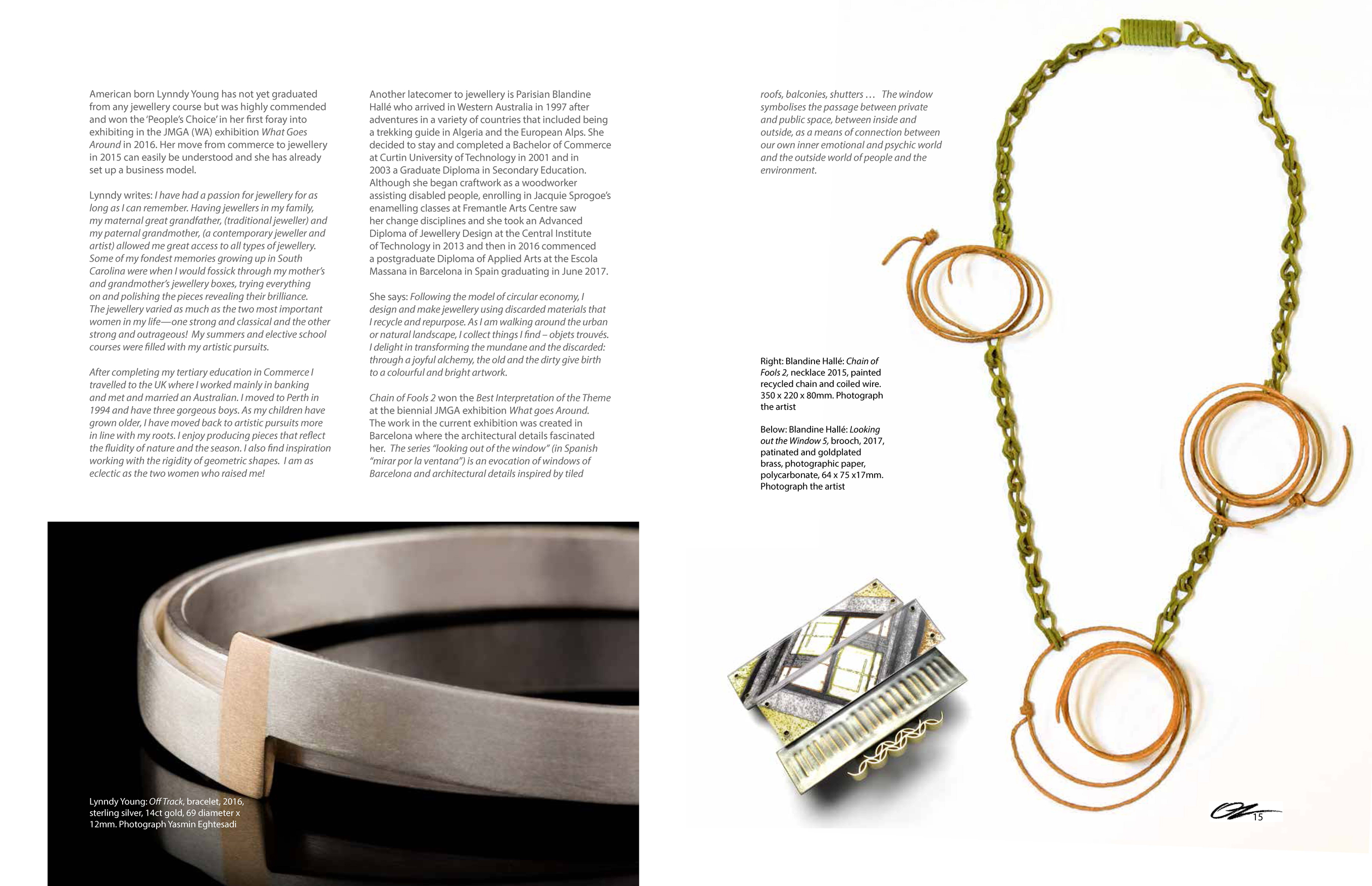 Un très bon article dans OZ ARTS Magazine, numéro 12 du printemps 2017 (article complet ici) par Dr Dorothy Erickson sur les bijoutiers qui participent à l’exposition WAnt à la Brunswick Street Gallery (du 18 au 30 août), dans le quartier branché de Fitzroy à Melbourne. Page 14 et 15 elle présente mon travail avec deux photos :