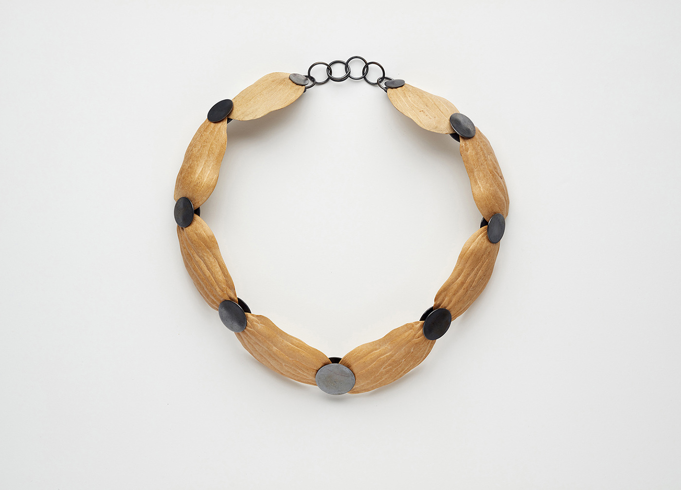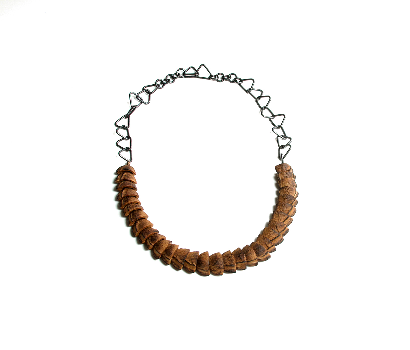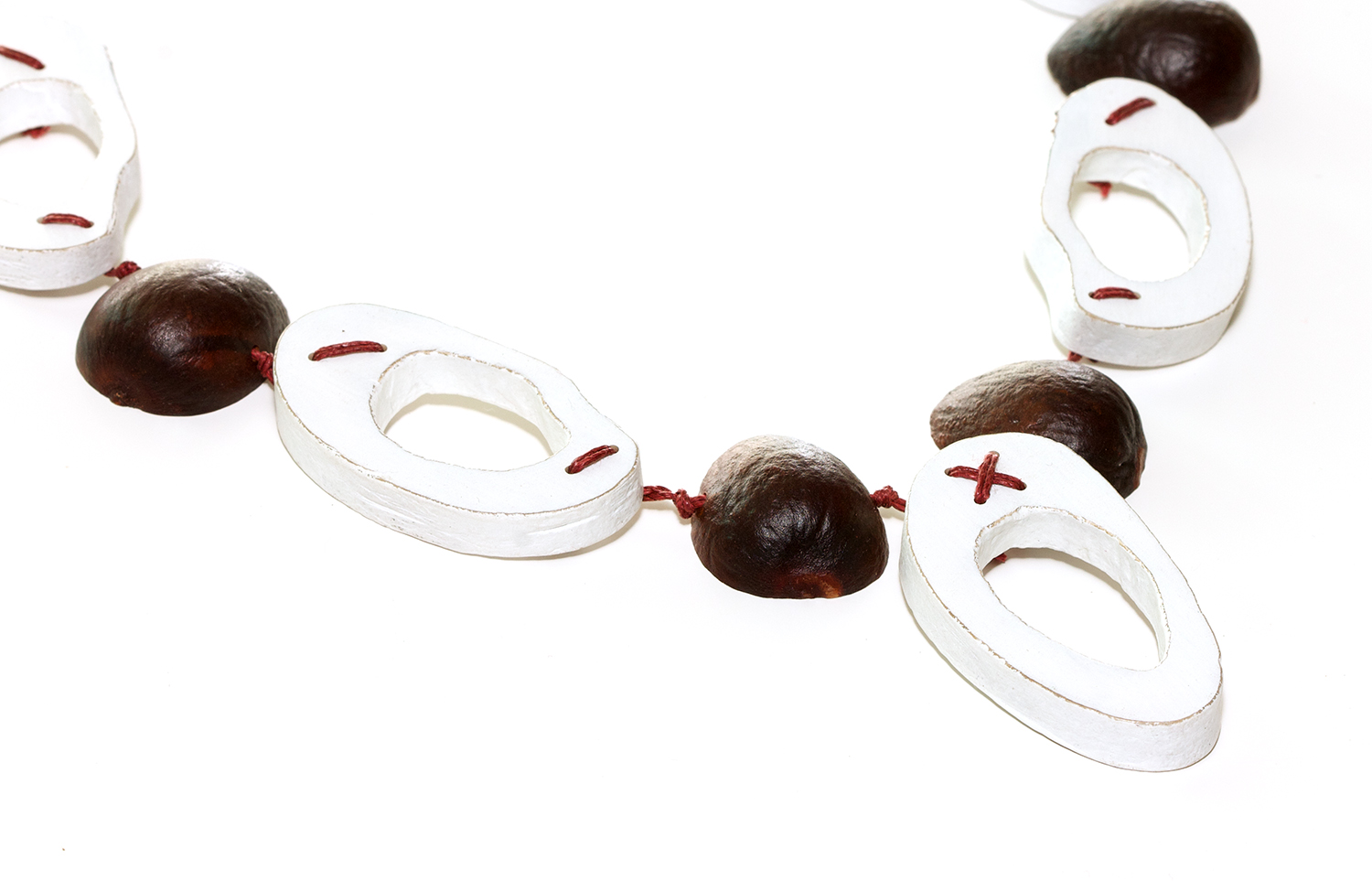 The use of the organic materials I gathered speak of my connection to the Australian land – parts of native plants from my garden, stones of fruits I ate, bone found on the beach and recycled local wood. At the end of their natural life cycle, I gave these materials a second life in my creations. They are burnt but still retain their integrity. I feel for other people and country, what hurts them hurts me, what hurts the animals and plants hurts me. There is a scar on the wood that stands for the scar in my heart. There is no “you” and “me” or “humans” and “plants” and “animals”. There is only “us”, we are all interconnected. In my necklaces the parts articulate with each other in complementarity, in their various shapes and colours. Black and white have equal value, beauty and richness come from diversity. I associate the circles and round pieces in my works to my sense of home in Australia, in respectful reference to the concentric circles the Australian indigenous people use in their artworks to represent a campsite, a fireplace and a meeting place.