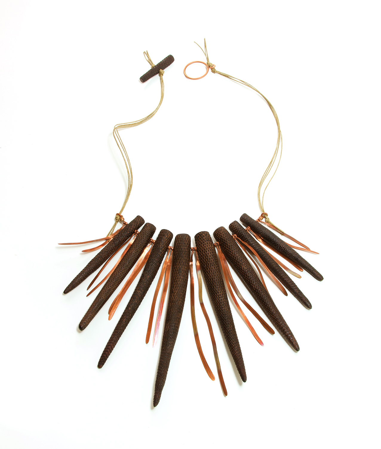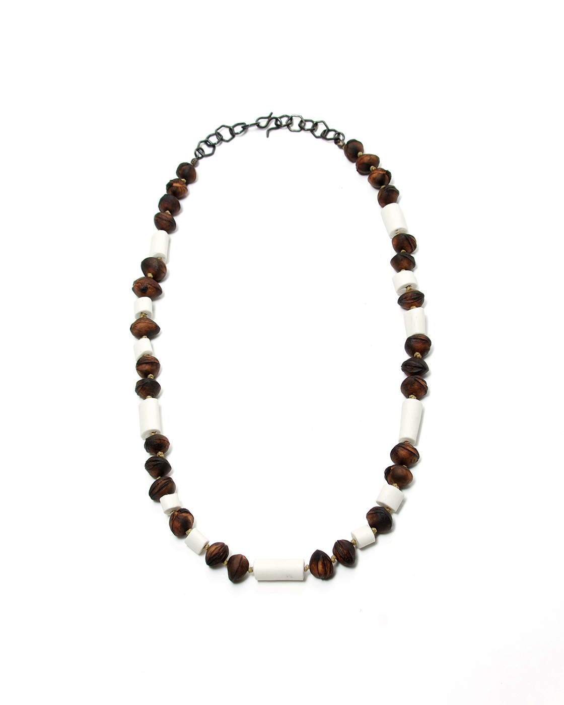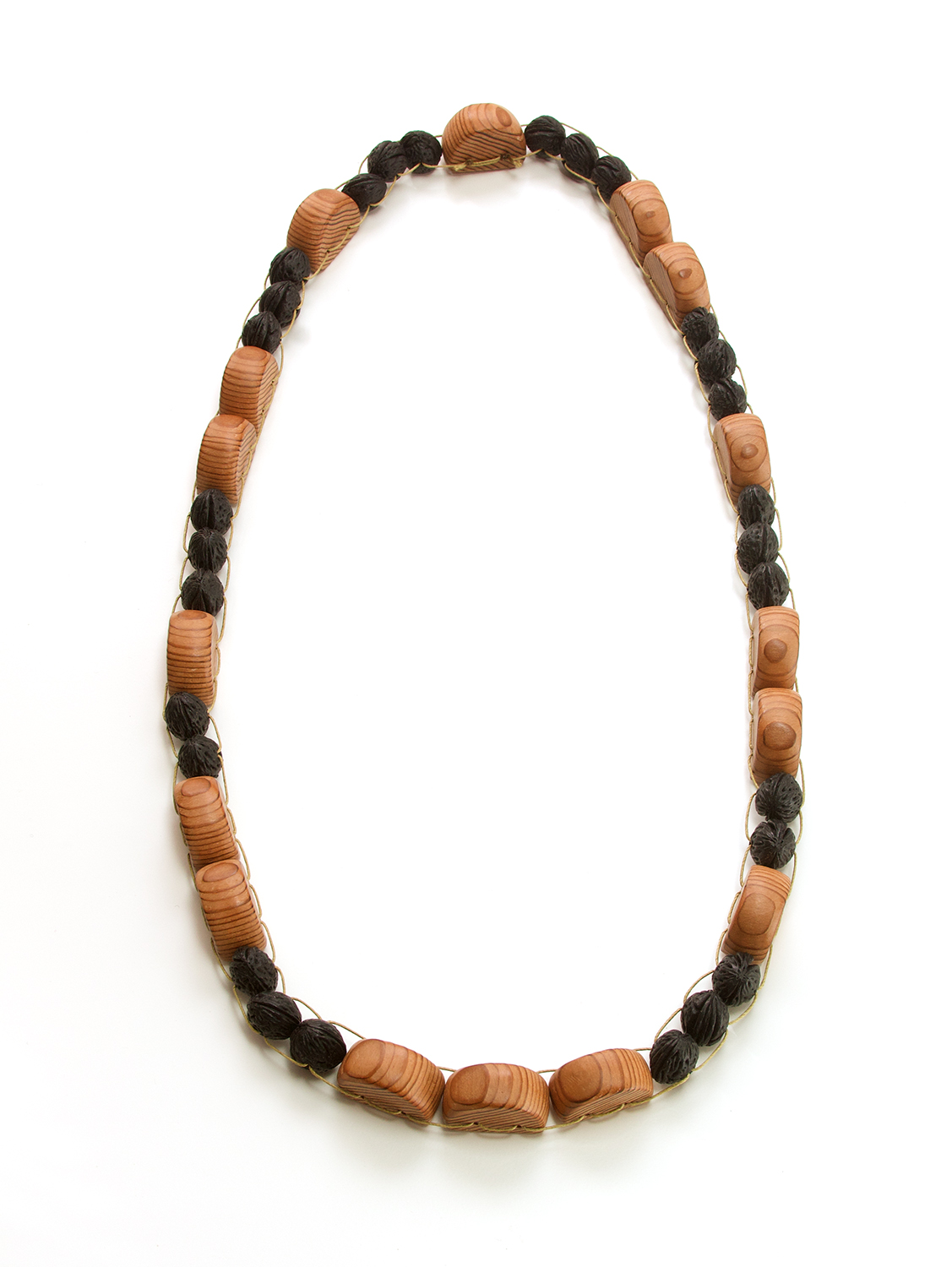 The use of the organic materials I gathered speak of my connection to the Australian land – parts of native plants from my garden, stones of fruits I ate, bone found on the beach and recycled local wood. At the end of their natural life cycle, I gave these materials a second life in my creations. They are burnt but still retain their integrity. I feel for other people and country, what hurts them hurts me, what hurts the animals and plants hurts me. There is a scar on the wood that stands for the scar in my heart. There is no “you” and “me” or “humans” and “plants” and “animals”. There is only “us”, we are all interconnected. In my necklaces the parts articulate with each other in complementarity, in their various shapes and colours. Black and white have equal value, beauty and richness come from diversity. I associate the circles and round pieces in my works to my sense of home in Australia, in respectful reference to the concentric circles the Australian indigenous people use in their artworks to represent a campsite, a fireplace and a meeting place.