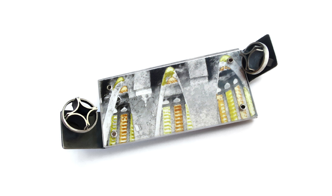 Starting from photos of buildings I took in my daily wanders around Barcelona, I then edited the photos and incorporated the digital images I had created into the design of 3D jewellery. During the first semester I worked with photos showing the original colours of the windows in a literal manner in the first 3 brooches.